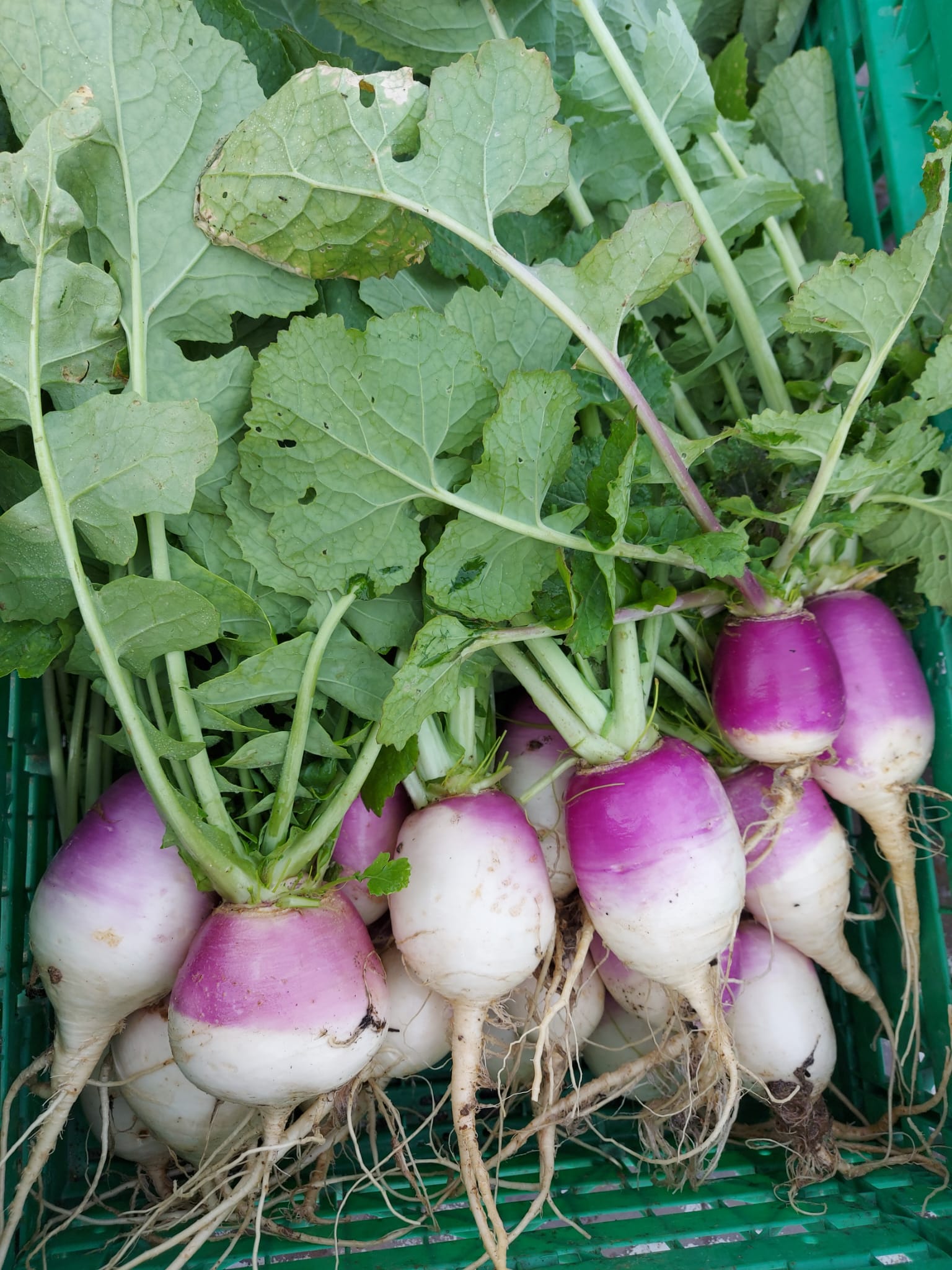 Botte de navets nouveaux violets avec leurs délicieuses fanes.